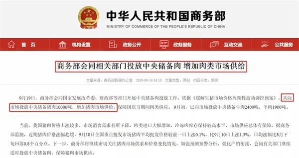 19日下午,国家商务部重磅发布《商务部会同相关部门投放中央储备肉增加肉类市场供给》,向市场投放中央储备猪肉10000吨,增加猪肉供应,做到市场供应总体有保障。