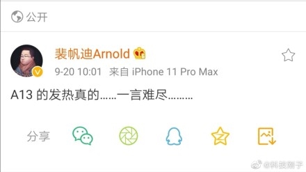 部分拿到iPhone 11的用户在社交媒体上表示,手机在使用时有发热问题,激活随便就50度: