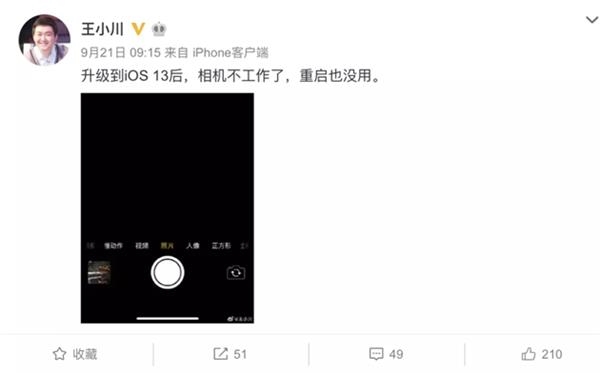 除此之外,搜狗CEO王小川日前也在微博上吐槽苹果,因为自己的iPhone升级iOS 13系统后,出现了相机不工作的情况。