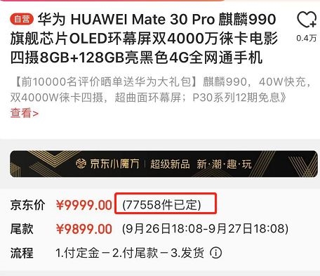 目前国内主要电商平台天猫、京东、苏宁、国美等已开启华为Mate30系列预售。截至9月24日12:00,京东华为官方旗舰店Mate30已预售15395台,Mate30 Pro已预售77558台;天猫华为官方旗舰店Mate30已预售4691台,Mate30 Pro已预售36227台。