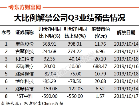 当前,正值三季报及三季报预告披露季,而业绩的好坏又在一定程度上影响着解禁的负面效果,那么上述大比例解禁公司的业绩又是怎样呢?