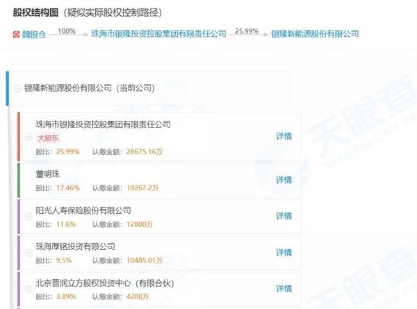 天眼查信息显示,目前,董明珠个人持股17.47%,创始人魏银仓100%控股的银隆集团仍是公司第一大股东,持股25.99%。