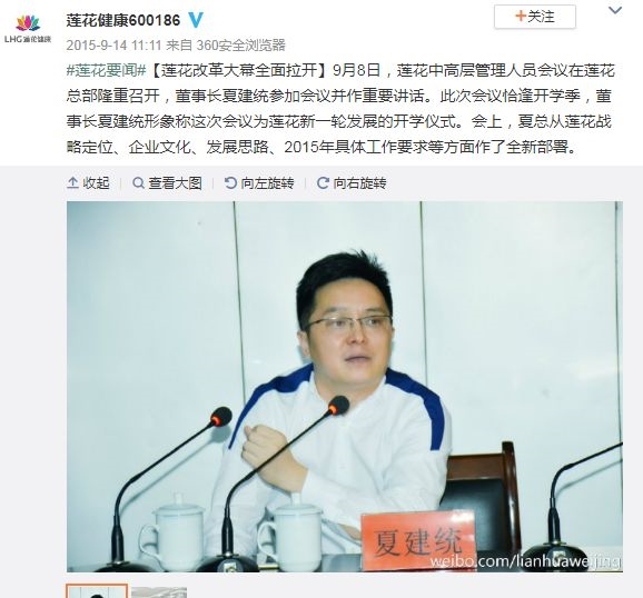 夏建统为莲花制定了非公开发行股票方案募集资金,除了布局传统主业味精及产业链继续扩大产能之外,公司还计划进军大健康、智慧农业、现代C2B等。2016年1月15日,莲花味精更名为莲花健康。