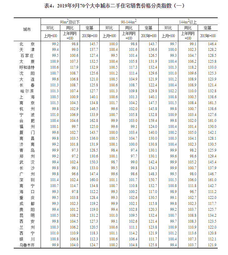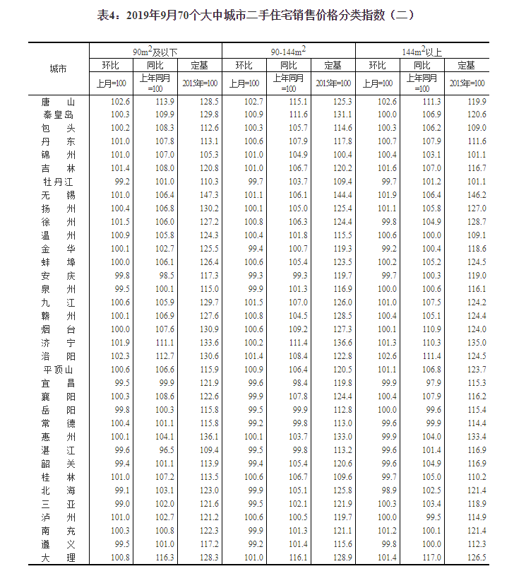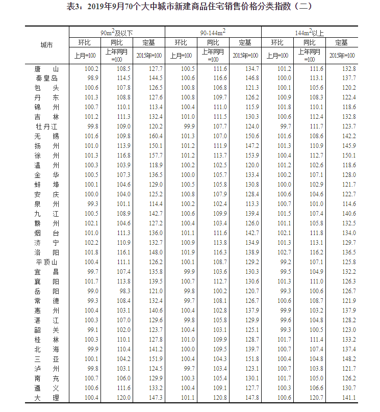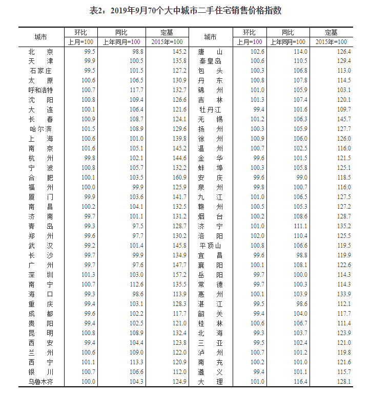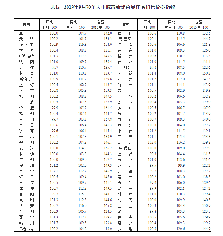 2019年9月份70个大中城市商品住宅销售价格变动情况