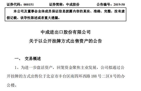 10月23日,中成股份公告称,公司第七届董事会第十九次会议全票通过了《关于以公开挂牌方式出售资产的议案》。