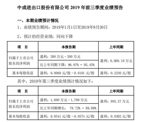 财报显示,近年来中成股份业绩有下滑趋势,2016-2018年净利润同比下滑幅度分别为25.04%、13.4%、4.51%。而公司半年报显示,今年上半年公司实现营收4.15亿元,同比下滑47.97%;净利润则为亏损1405.12万元,同比下滑124.66%。