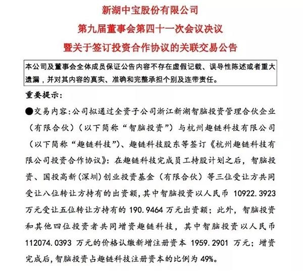 2018年5月,A股公司新湖中宝通过全资子公司浙江新湖智脑投资管理合伙企业,与杭州趣链科技有限公司签署投资合作协议。