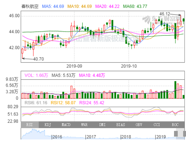 截至发稿,春秋航空股价跌0.57%,报45.12元。若按49.5元的目标价计算,该股未来约有近10%的上行空间。