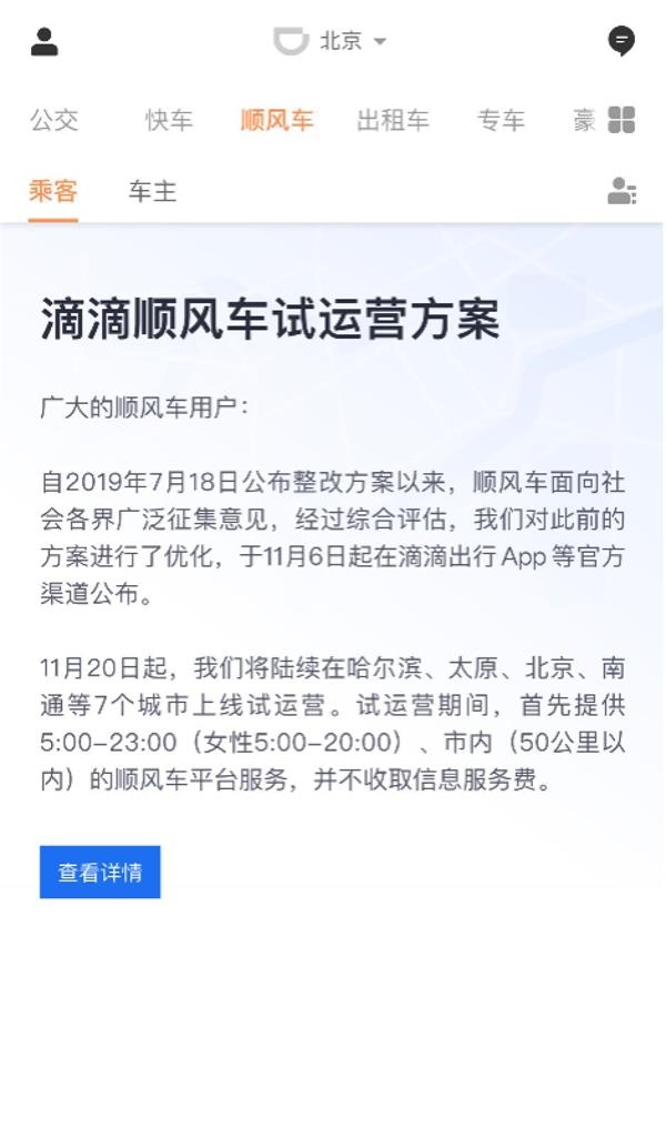 滴滴顺风车复活:11月20日起将陆续在北京等7城上线试运营