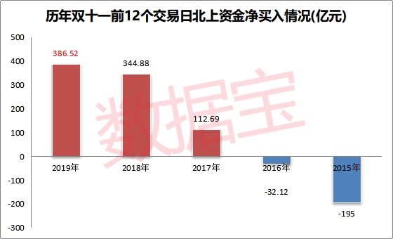 与往年比,今年双十一北上资金扫货更疯狂。证券时报·数据宝统计显示,2015年、2016年双十一(不含11月11日数据)前12个交易日北上资金均为净流出状态。虽然2018年双十一前12个交易日净买入额也超300亿,但仍低于今年同期水平。