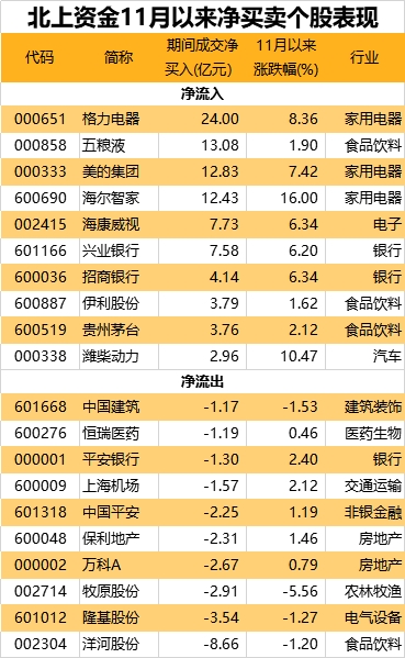 先从活跃股来看,39只上榜股中有26股获净买入,这26股平均上涨4.23%,仅3股小幅下跌;相比之下,13只净卖出股仅小幅上涨0.15%。举例来看,净买入24亿的格力电器11月以来股价上涨8.36%,净买入12.43亿元的海尔智家本月以来股价涨幅最高,达到16%。