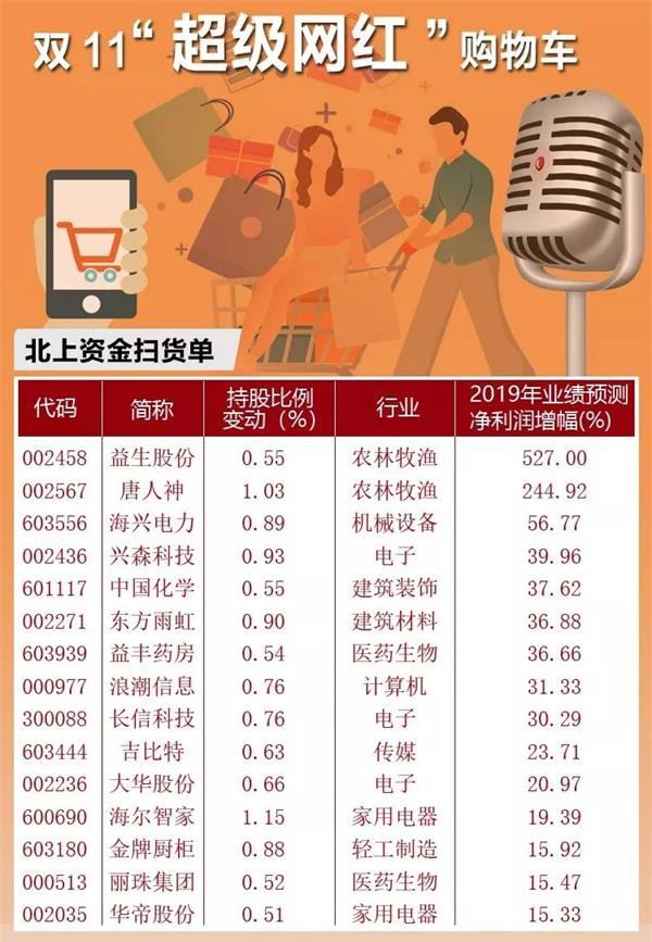在购物节期间,北上资金又主要青睐哪些股票?以持股比例变动来看,增仓超0.5个百分点的45股电子、家用电器、医药生物及农林牧渔行业数量较多。5股北上资金持股比例增加超1个百分点,依次为九阳股份、工业富联、海尔智家、拉夏贝尔及唐人神。