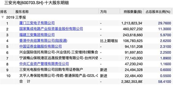 三季报显示,国家集成电路产业基金对三安光电持股11.3%,为第二大股东;中央证金、中央汇金分别持股2.31%、1.16%,目前分列第五、第八位;北上资金通过陆股通持股2.62%;兴业信托、太平人寿的产品账户均有持仓。