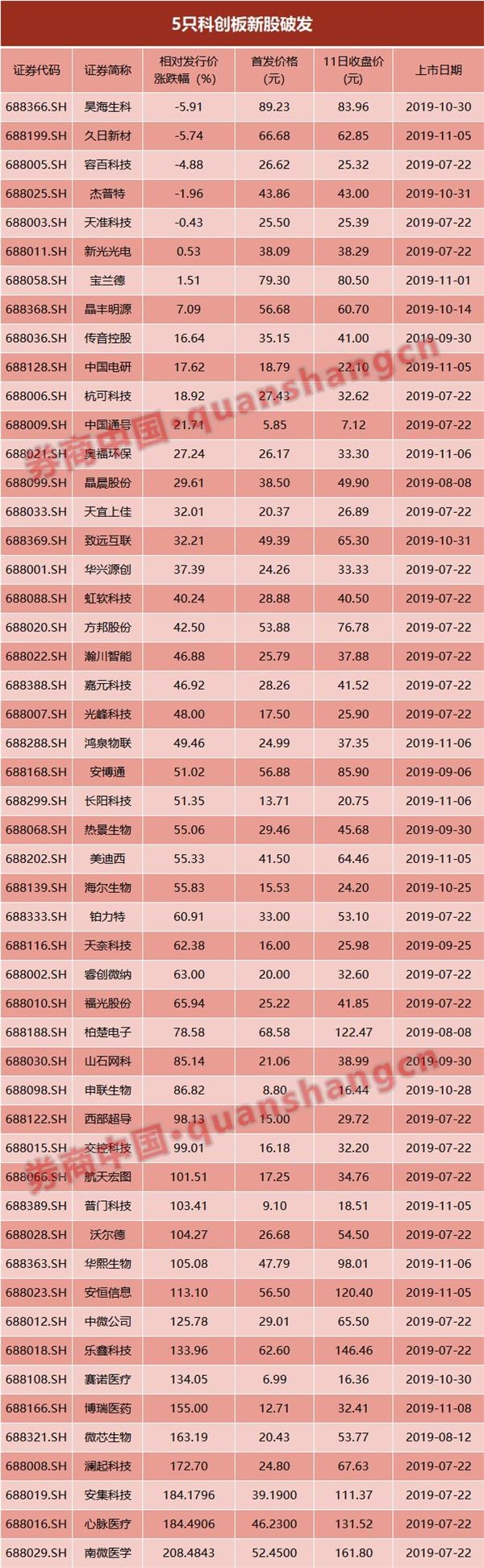 据记者统计,截至11月11日收盘,在科创板上市的51只新股中,已有5只跌破发行价,分别是昊海生科久日新材容百科技杰普特以及田准科技,相对发行价的涨跌幅分别为-5.91%、-5.74%、-4.88%、-1.96%、-0.43%。