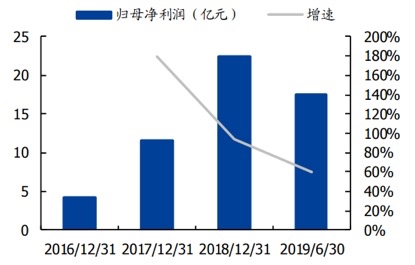 招股书显示,2016-2018年,公司营收由37.24亿元人民币增至103.92亿元人民币,年复合增速达67.05%;归母净利润由4.17亿元人民币增至22.42亿元人民币,年复合增速达131.87%。而2019年上半年,公司营收和归母净利润的增速分别下滑至34.37%和60.41%。