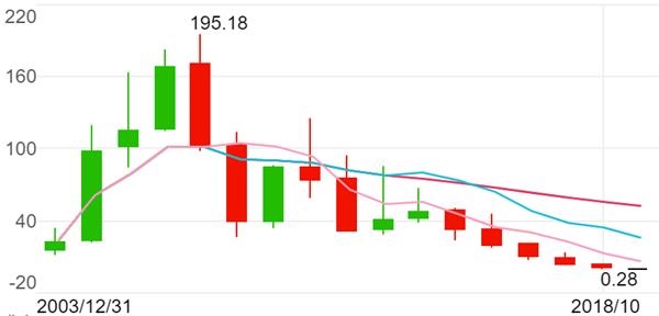 然而,在经历了2007年的巅峰之后,西尔斯业绩迅速下滑,股价也在经历了最高点后断崖式下跌,从最高的195.18美金到2018年的25美分。