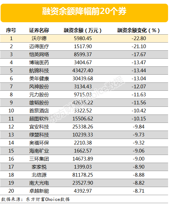 与之形成对比的是,当日有829股融资余额出现下降。其中,融资余额降幅超过3%的有117只。沃尔德的融资余额降幅最大,最新融资余额5980.45万元,与前一个交易日相比,融资余额下降了22.80%。
