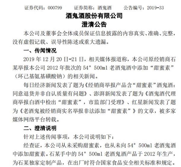 酒鬼酒12月22日公告回应称,经查证,本公司从未采购甜蜜素,也从未向54°500ml老酒鬼酒中添加甜蜜素。石某手中的54°500ml老酒鬼酒产品于2012年生产,为石某独家定制产品,在出厂时符合国家食品安全相关标准和规定。