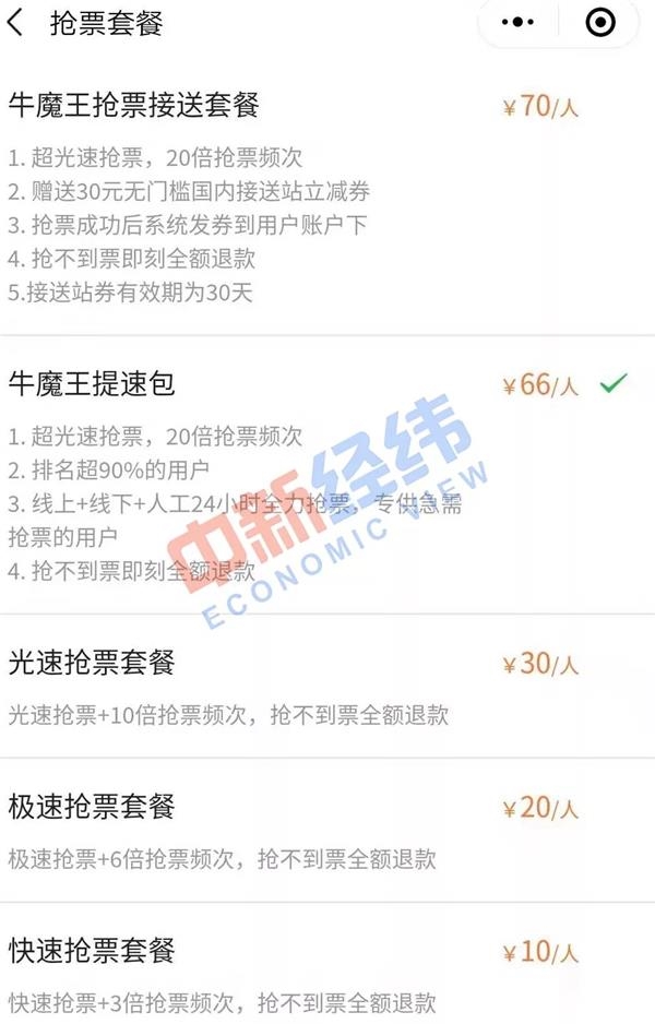 此外,还有智行APP推出的铂金会员年卡50元,可享受VIP抢票、优先特权、首单候补购票保障等服务;快票出行APP推出5档抢票加速包服务,价格从20元至40元不等;途牛旅游APP推出了6档抢票提速包服务,价格从10元至70元不等,其中,牛魔王抢票接送套餐售价70元/人,声称超光速抢票、20倍抢票频次等。