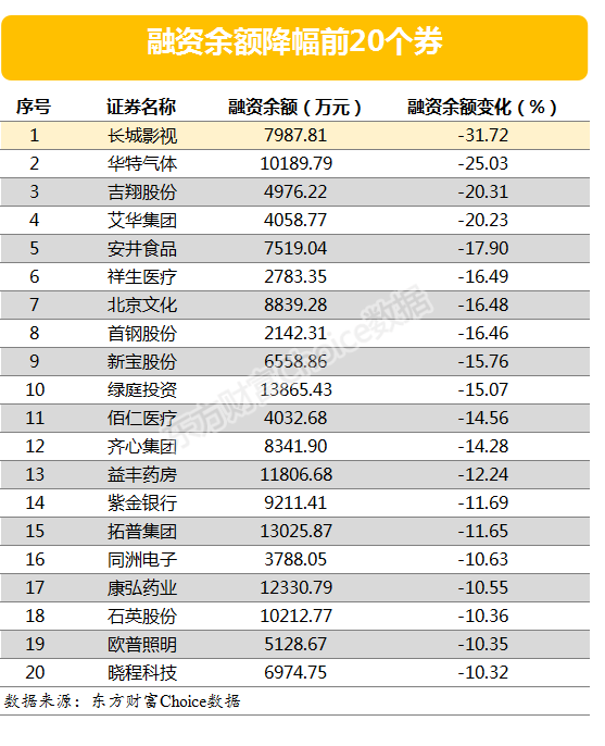 与之形成对比的是,当日有954股融资余额出现下降。其中,融资余额降幅超过3%的有97只。长城影视的融资余额降幅最大,最新融资余额7987.81万元,与前一个交易日相比,融资余额下降了31.72%。