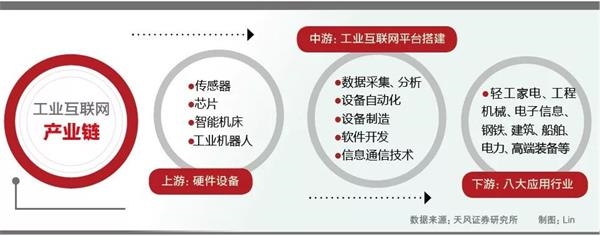 天风证券在研报中对工业互联网产业链进行归类,其中上游以硬件设备为主,主要包括传感器、芯片等;产业中游的核心是工业互联网平台搭建,涉及数据产业、软件开发等;而产业下游应用端涉及广大传统制造行业例如,轻工家电、工程机械等。