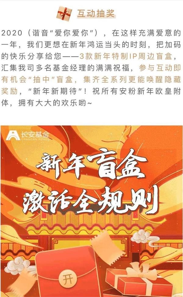 自上周一起,长安基金推出了“新年盲盒”活动,且同时在蚂蚁财富、天天基金网、今日头条、同花顺、国泰君安君弘等多个平台上线。