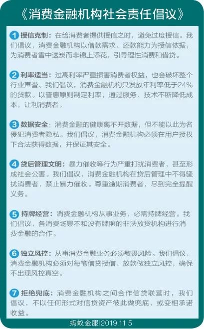而作为消费金融的集大成者,蚂蚁金服还发起了《消费金融机构社会责任倡议》,倡议包括授信克制、利率适当、数据安全、贷后管理文明、持牌经营、独立风控和拒绝兜底7个方面的内容,主张正本清源,建设健康的消费金融环境。