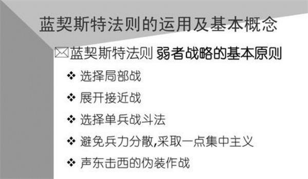 1970年至今,日本企业界有一个很风靡的战略思考方式,叫“蓝契斯特”法则。这个法则最早诞生于军事领域,它分为第一法则和第二法则。在这里,我们着重讲述第一法则,即战斗力=武器的效率(质)×兵力的数量(量),从而引出“弱者战略”。