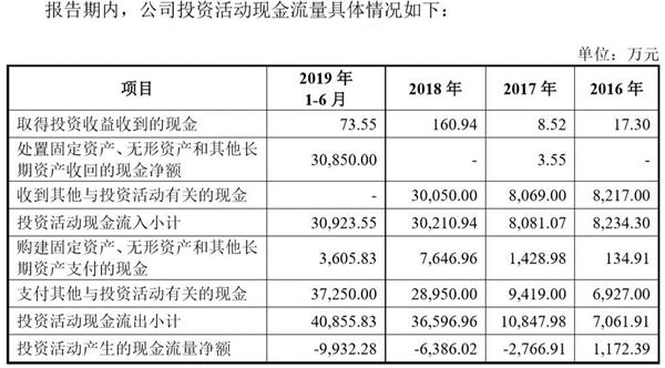 2016年至2019年1-6月,有方科技投资活动产生的现金流量净额分别为:0.12亿元、-0.28亿元、-0.64亿元、-0.99亿元。同期内支付其他与投资活动有关的现金额度逐年攀升,分别为0.69亿元、0.94亿元、2.90亿元、3.73亿元,分别占投资活动现金流出额为98.10%、86.84%、79.11%、91.18%。占比如此之高的“其他与投资活动有关的现金流支出”其实就是“除构建固定资产、无形资产和其他长期资产支付的现金”之外的支出。同时据招股书中有方科技对投资活动现金流解释:“报告期内投资活动现金流入、流出主要为理财产品的购入和赎回、固定资产、无形资产和其他长期资产购置支出。”