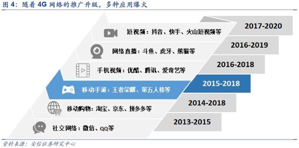 2013年以来,4G的推广升级也带来了微信、淘宝、京东、爱奇艺、斗鱼、抖音等多种应用的爆火,推出这些应用的公司在资本市场上也收到了大量资金的追捧。一个明显的趋势是,随着4G网速的提升,移动流量资费的下降,智能手机的更新换代,泛娱乐形态开始向视频进化,视觉体验超越了文字、图片、音乐、语音成为最重要的体验目标。