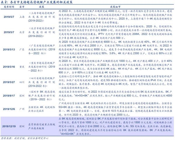 随着我国《超高清视频产业发展行动计划(2019-2022年)》的出台,各省市对应的《行动计划》也纷纷出炉,紧抓5G发展带来的产业机遇。2019年5月以来,上海、北京、广东、重庆、四川、深圳等多地均有相关产业政策出台,支持当地超高清视频产业发展。