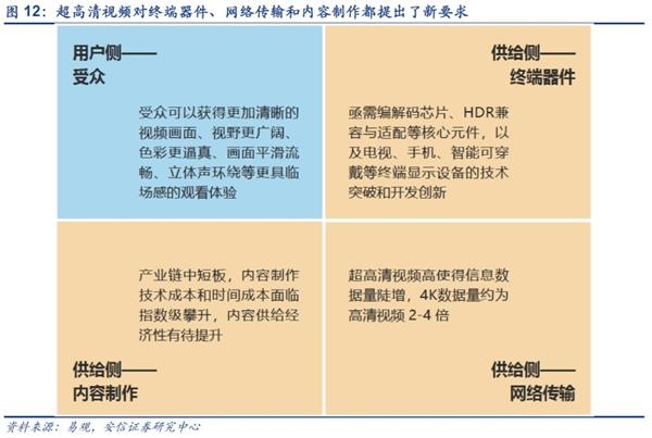 超高清视频让受众可以获得更加清晰的视频画面、视野更广阔、色彩更逼真、画面平滑流畅、立体声环绕等更具临场感的观看体验,这也对终端器件、网络传输和内容制作都提出了新要求,这三大领域也是超高清视频带来的主要投资机会。