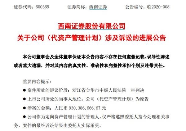 历时一年零三个月,西南证券此前一笔巨额诉讼结果终于落地。