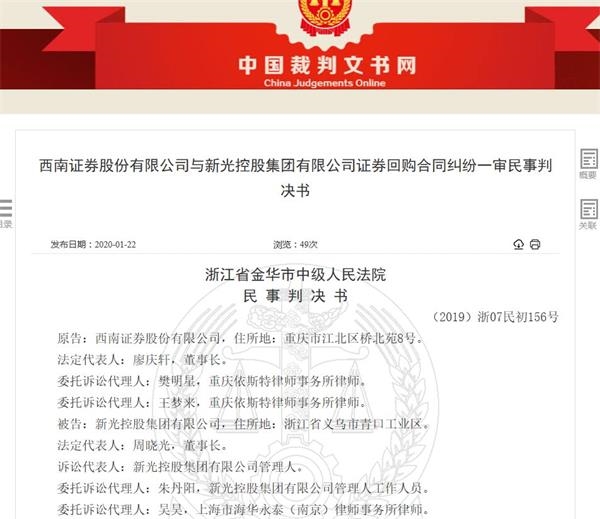 根据判决书,早在2016年5月,新光控股即与西南证券签订股票质押式回购交易业务协议。此后,西南证券在2016年5月-6月分3笔向新光控股提供10亿元资金,购回年利率为6.9%,购回期限为3年,违约金率为千分之一。新光控股仅在2017年10月回购2亿元,在2018年9月因未支付融资利息构成违约。