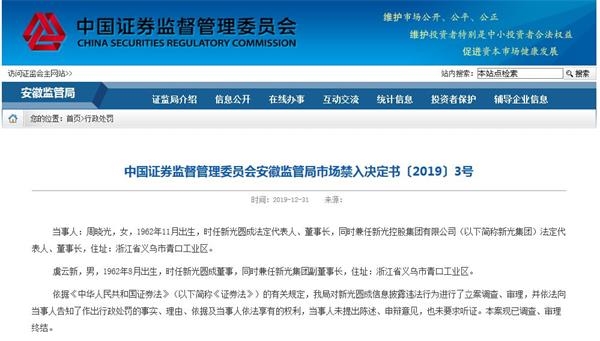 2019年年底,由于指使、安排新光控股非经营性占用上市公司资金的关联交易事项、上市公司违规担保事项、共同借款事项,不履行信息披露义务,周晓光、虞云新夫妇被安徽证监局分别处以30万元处罚,并处10年市场禁入。另外,由于新光控股未告知一致行动人关系,导致ST新光定期报告未披露相关情况,新光控股被处以60万元罚款、周晓光被处以20万元罚款。