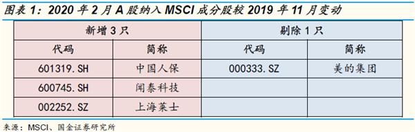 本次A股纳入MSCI成分股的变化:与2019年11月公告名单相比,本次A股纳入MSCI全球指数体系的成分股新增3只:中国人保、闻泰科技、上海莱士;剔除1只:美的集团。根据MSCI安排,以上变动将在2月28日盘后生效,届时跟踪MSCI指数的被动资金将按照上述变动进行调仓。