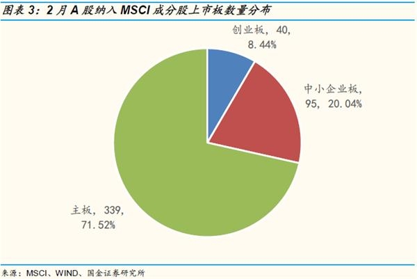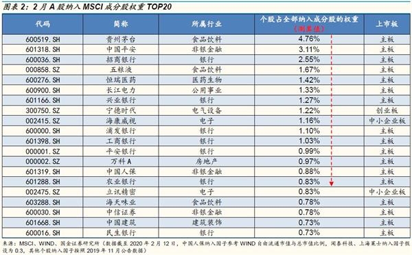 2月A股纳入MSCI成分股共有474只,“贵州茅台、中国平安、招商银行、五粮液、恒瑞医药”等个股权重较高,成分股主要集中在“银行、非银金融、食品饮料、医药生物、电子”等行业。本次调整后,A股纳入MSCI最新成分股共计474只,权重个股依次包括“贵州茅台、中国平安、招商银行、五粮液、恒瑞医药”等;上市板分布上,主板339只,创业板40只,中小板95只;行业分布上,“银行、非银金融、食品饮料、医药生物、电子”等行业权重较高,分别为13.15%、11.14%、10.78%、9.86%、8.58%。