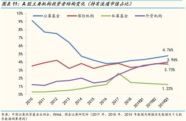 A股投资者结构重塑,外资话语权不断提高。随着外资的加速流入,A股投资者结构中外资占比快速提升。当前机构投资者中,从持有流通市值占比角度来看,公募占比最高,为4.76%;其次为外资,占比3.96%;第三为保险,占比3.73%。与近两年外资加速流入一致,外资占比从2016年之后快速上升,已超越保险,未来预计还将进一步提升。
