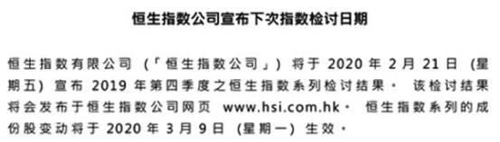 除了外资动作频繁,互联互通市场也将很快有动作。此前,恒生指数公司宣布,将于2020年2月21日宣布2019年第四季度的恒生指数系列检讨结果,并会在3月9日(星期一)正式生效,对应的港股通名单也将会在3月9日调整生效。