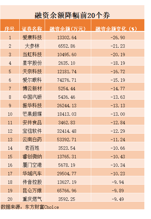 与之形成对比的是,当日有651股融资余额出现下降。其中,融资余额降幅超过3%的有142只。爱康科技的融资余额降幅最大,最新融资余额1.33亿元,与前一个交易日相比,融资余额下降了26.90%。