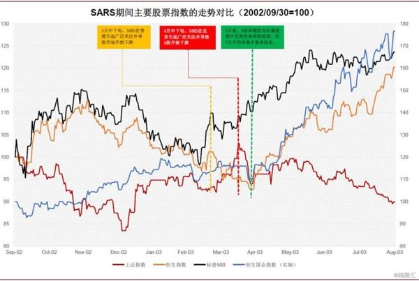 首先,回顾一下SARS事件中市场反应情况。整体而言,2003年3月中旬,SARS在香港引起广泛关注并导致市场下跌,4月底港股已到最恐慌之时,遂见局部底部,之后开始修复上涨,直到7月中旬才结束。