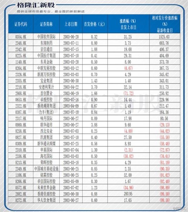 说完大环境情绪,我们继续聚焦于港股的新股市场,彼时新股市场表现如何?下图为SARS期间(2003年2月-7月)香港市场首发上市的股票一览。