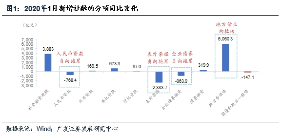 1月新增社融5.07万亿元,扣除国债和一般债得到老口径新增社融5.02万亿元,较去年4.6万亿同比多增4067亿元。拆解分项,今年1月显著正贡献的分项主要是地方专项债,单项同比多增6060亿元(数据来自财政部公布的专项债1月融资规模,wind债券板块数据与此呼应)。委托贷款、股票融资、外币贷款和信托贷款也有小幅增长,分别同比多增673亿元、320亿元、170亿元和87亿元。表内人民币贷款、表外票据和企业债券融资分别同比少增768亿元、2384亿元和964亿元。表内信贷似乎比去年略低,但评估本月社融情况还需考虑如下两点因素。