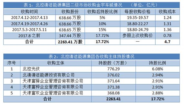 北控清洁能源集团通过北控光伏等5家全资子公司,分四批收购金宇车城股份。截至2017年8月,北控光伏等5家公司合计收购金宇车城2263.41万股,持股比例17.72%。初步估算,北控能源集团投入的收购资金应在5亿元左右(表1、表2)。