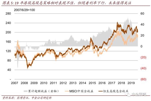 在这样的背景之下,以美国十年期国债收益率为代表的全球利率水平创下0.76%的多年新低(图1),中国十年期国债收益率也跌破2016年低位,达到2.62%的低位,中国市场不少投资者也预期中国官方利率未来也有调降空间。结合其他市场条件,我们认为当前高股息策略是我们推荐的“纯内需”策略之外的另外一个稳健收益之选,稳健增长+高股息则是低利率环境中的中长线可行的配置策略。