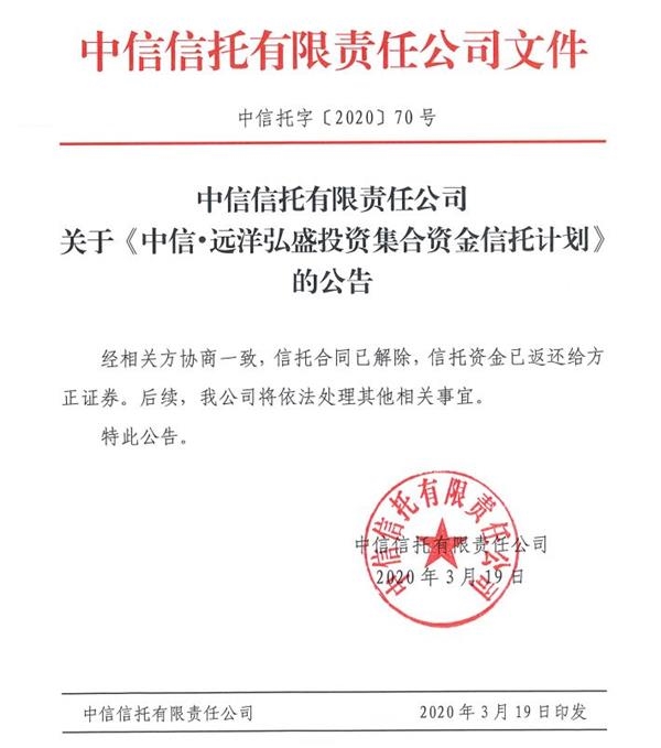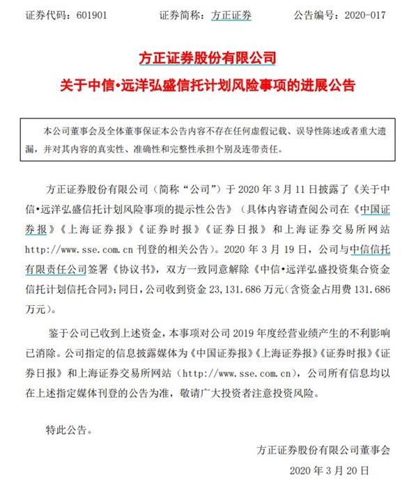 3月19日晚间,方正证券发布公告称,其在当日与中信信托签署《协议书》,双方一致同意解除信托合同。同日,方正证券收到资金2.31亿元。有知情人士向券商中国记者透露,其资金系中信信托归还。随即,中信信托也在第一时间做出回应:信托合同已解除,信托资金已返还。