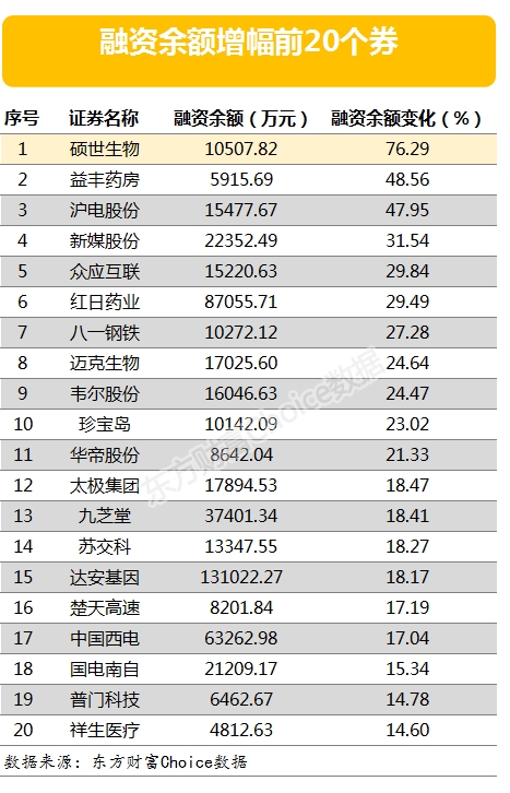 融资余额增幅最大的是硕世生物,该股最新融资余额10507.82万元,较前一交易日增长76.29 %。另外,融资余额增幅较大的还有益丰药房沪电股份等,增幅分别达48.56 %、47.95 %。