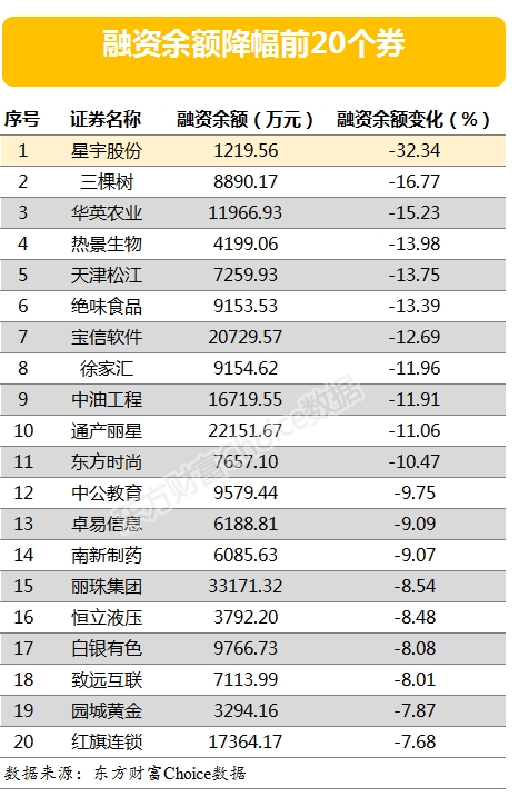 与之形成对比的是,当日有789股融资余额出现下降。其中,融资余额降幅超过3%的有89只。星宇股份的融资余额降幅最大,最新融资余额1219.56 万元,与前一个交易日相比,融资余额下降了32.34 %。