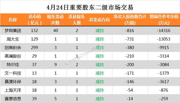 4月24日,两市共有9家公司公告进行重要股东二级市场交易。其中梦网集团净减持816万股,减仓参考市值为14316万元。