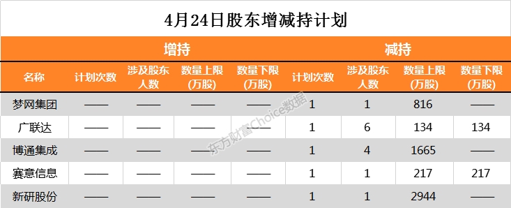 4月24日,两市共有5家公司公告股东减持计划,包括广联达新研股份等。